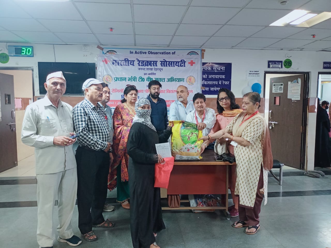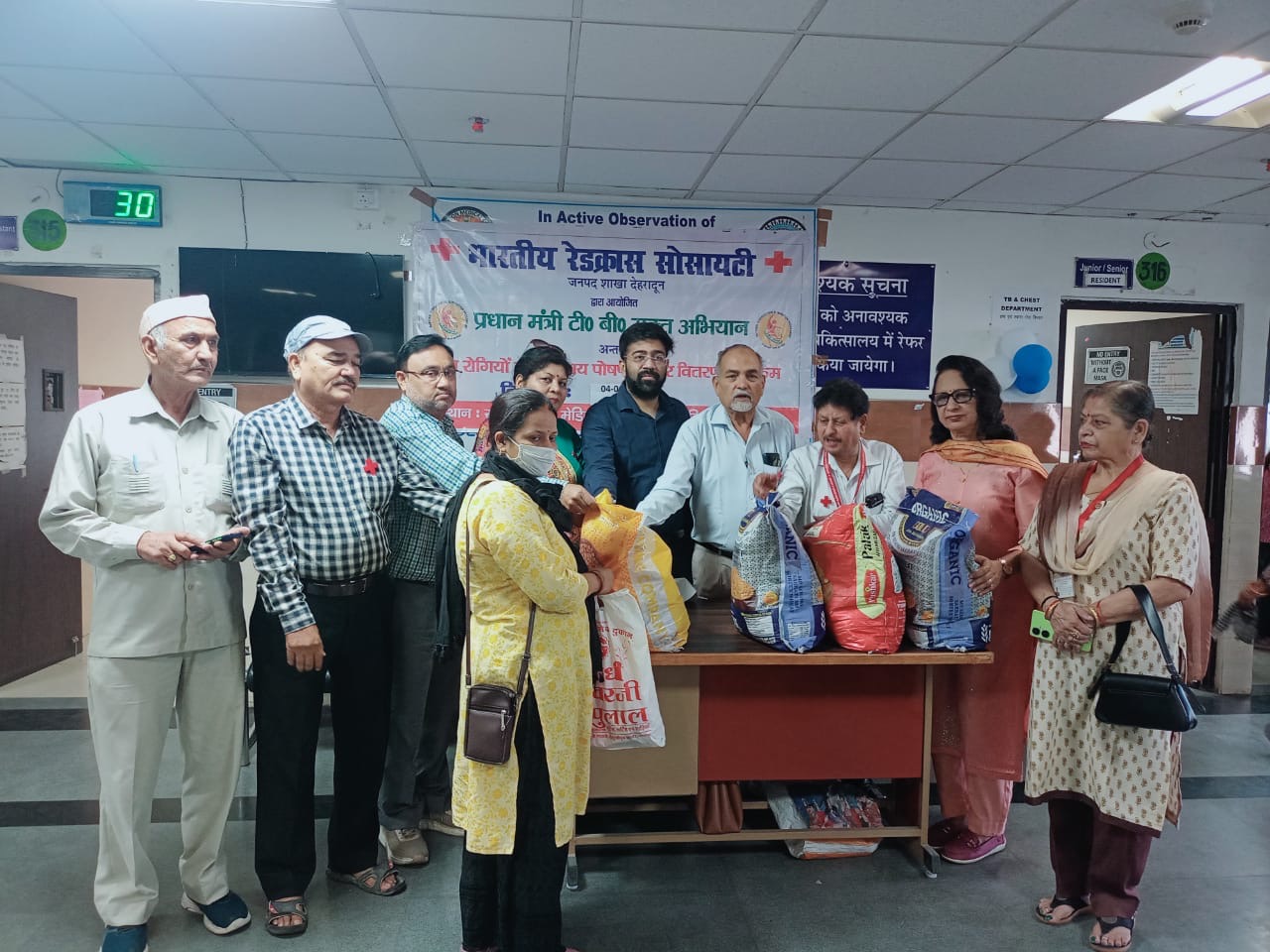 आज दिनांक 4 जून 2025 को भारतीय रेड क्रॉस शाखा देहरादून द्वारा मुख्य चिकित्सा अधिकारी डॉ मनोज शर्मा जी निर्देश परप्रधानमंत्री टी बी मुक्त भारत अभियान के अंतर्गत निक्षय पोषण योजना द्वारा टी बी मरीजों को दून मेडिकल कॉलेज में राशन किट वितरित किए गए भारतीय क्रॉस देहरादून द्वारा 25 निक्षय मित्र बनाए गए जिसमे निक्षय मित्र द्वारा क्षय रोगियों को प्रतिमाह राशन किट वितरित करना है एक पोषण किट की लागत लगभग रुपए 1000 है जो की 6 माह तक करना है । रेड क्रॉस के स्वयंसेवकों द्वारा 25 मरीज गोद लिए गए हैं । इस योजना का मुख्य उद्देश्य टी बी मरीजों को पोषण संबंधी सहायता प्रदान करना उन्हें टी बी के इलाज में स्वस्थ रहने के लिए मदद करना है कुपोषण टी बी के इलाज में एक बड़ी चुनौती है यह योजना टी बी के रोगों को पोषण संबंधी सहायता प्रदान करके टी बी के इलाज में मदद करता है इस कार्यक्रम को सफल बनाने के लिए विशेष पहल क्षय रोग अधिकारी डॉ मनोज वर्मा द्वारा इस कार्यक्रम को सुचारू रूप से चलने पर विशेष जोर दिया जा रहा है आज के पोषण वितरण कार्यक्रम में दून मेडिकल कॉलेज के फेफड़ा रोग विशेषज्ञ डॉक्टर मानवेंद्र गर्ग एवं भारतीय रेड क्रॉस देहरादून के चेयरमैन डॉक्टर एम एस अंसारी सचिव कल्पना बिष्ट डॉ मनोज गोविल रमा गोयल अनिल वर्मा प्रेमलता वर्मा राकेश डंगवाल नारायण सिंह राणा इत्यादि उपस्थित थे । श्रीमती रमा गोयल और श्री विकास गुप्ता द्वारा पांच-पांच मरीज गोद लिए गए हैं।